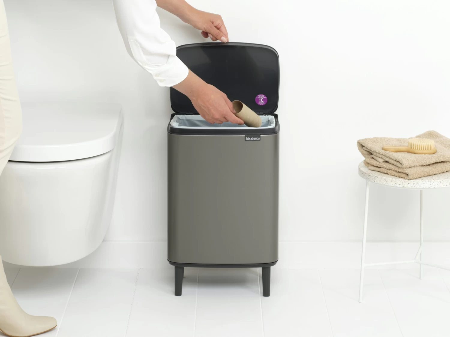 De Brabantia Bo Hi afvalemmer 12 liter is een beauty op vier elegante pootjes. Het unieke deksel is eenvoudig te openen vanaf de linker-, rechter- en voorkant van de bak. Je hoeft dus niet meer met je arm te draaien om er iets in te doen. Nog een pluspunt: de handgreep voor eenvoudig verplaatsen en legen. En dankzij zijn formaat en design doet deze prullenbak het goed in elke ruimte. Een sprookjeskast!Voordelen & Kenmerken