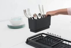 Kleine keuken? Verspil geen ruimte op het aanrecht aan drogende vaat, gebruik dit Brabantia SinkSide compacte afdruiprek. Ontworpen voor een klein aanrecht, maar met ruimte voor 5 borden, een afneembaar bestekbakje en een plat gedeelte voor glazen en dergelijke. Een reusachtig handig klein afdruiprek!