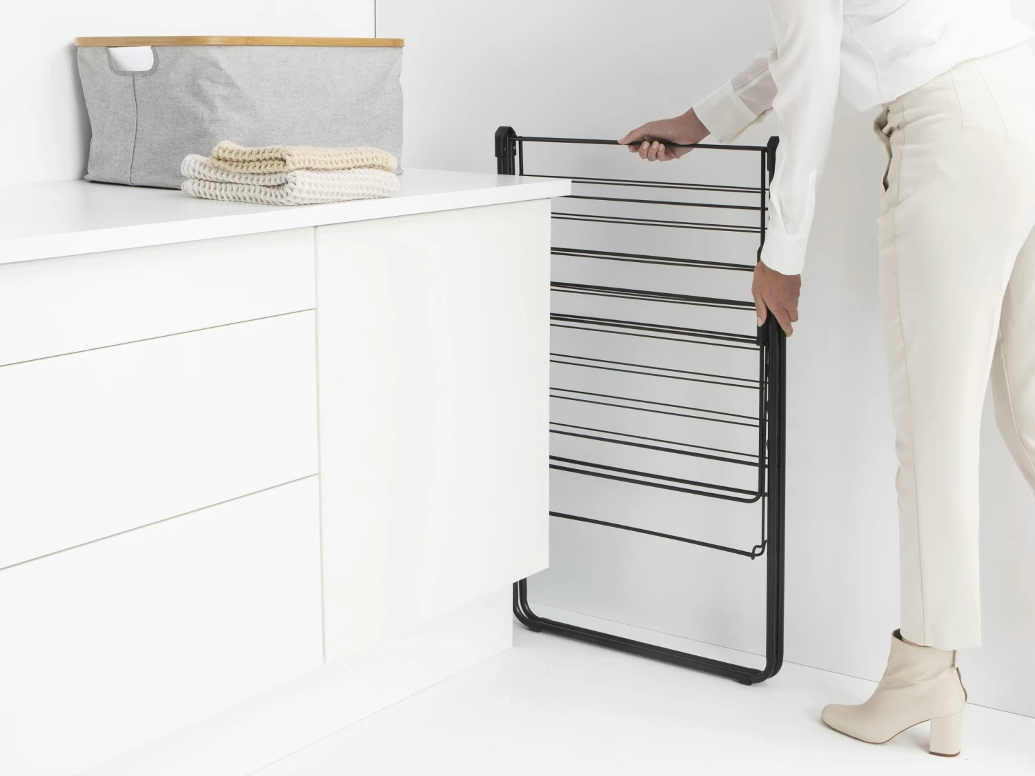 Bespaar tijd en energie door je was natuurlijk te drogen – en bespaar ruimte door het met dit slimme rek te doen! Dit Brabantia HangOn Droogrek heeft 20 meter droogruimte en haken voor 6 kleerhangers. Zo kun je dus overal in huis je broeken hangend drogen of je delicate kledingstukken plat drogen. Alles droog? Klap hem in en berg ‘m op. De beste hangplek voor je was!