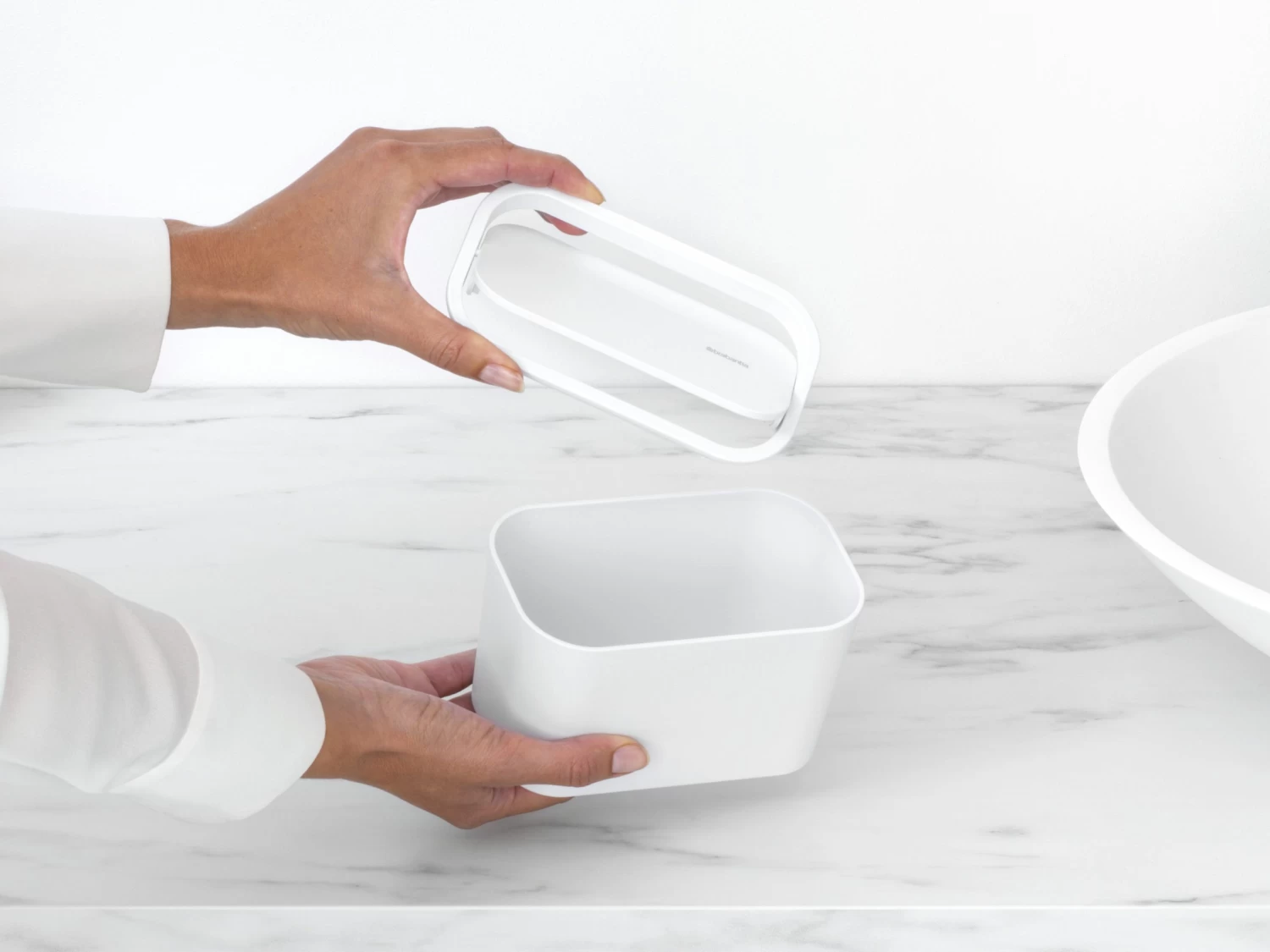 Houd je wastafel schoon en netjes met dit Brabantia MindSet badkamer afvalbakje! Een baby afvalbakje met klapdeksel, ideaal voor het weggooien van wattenstaafjes of pads. Stijlvol, hygiënisch en te bedienen met één hand. Voor een mooi georganiseerde badkamer.