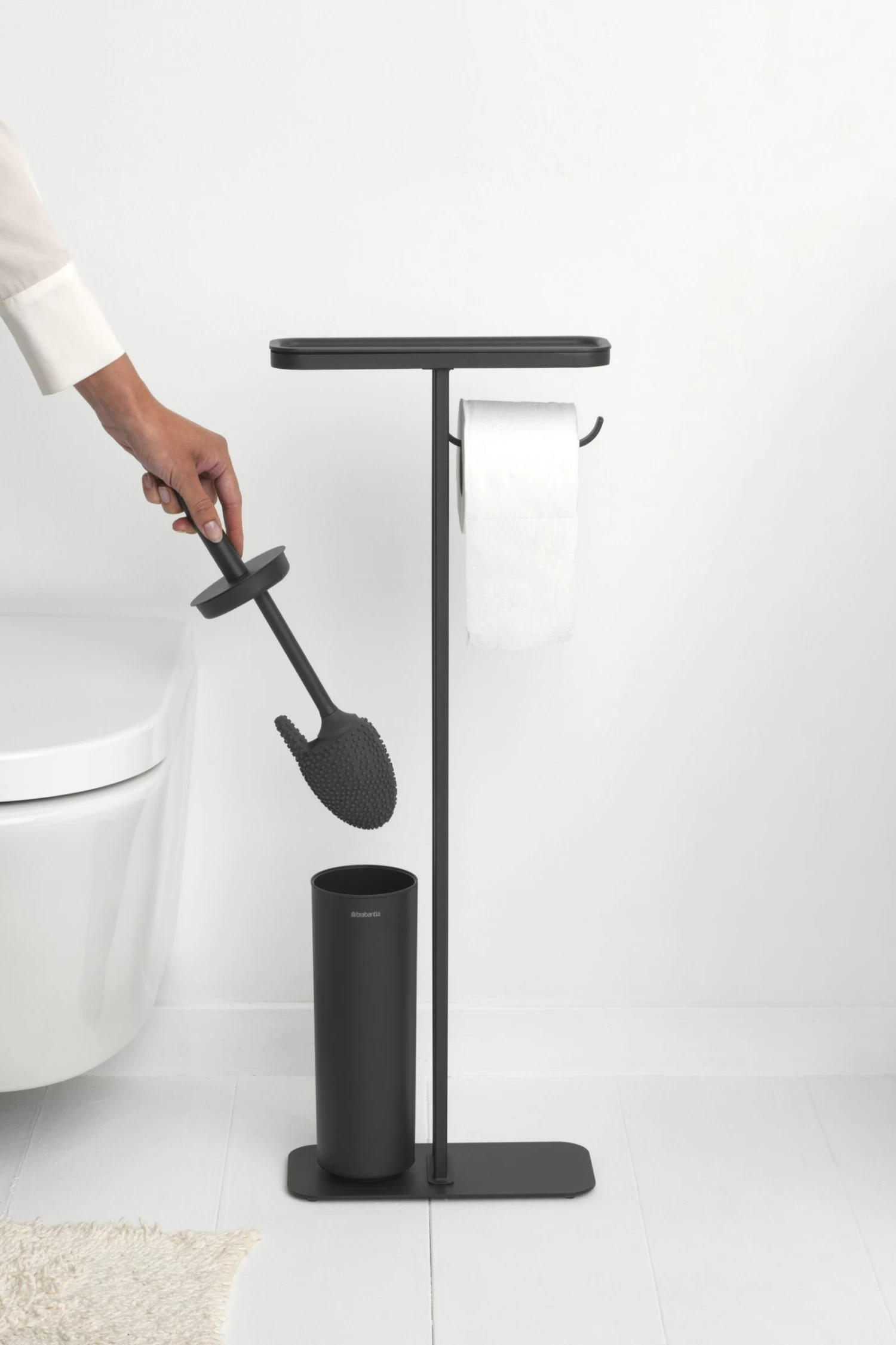 Alles-in-één – plankje, toiletrolhouder en toiletborstel in één standaard.