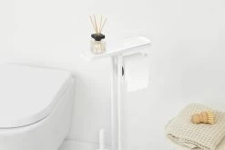 Alles-in-één – plankje, toiletrolhouder en toiletborstel in één standaard.