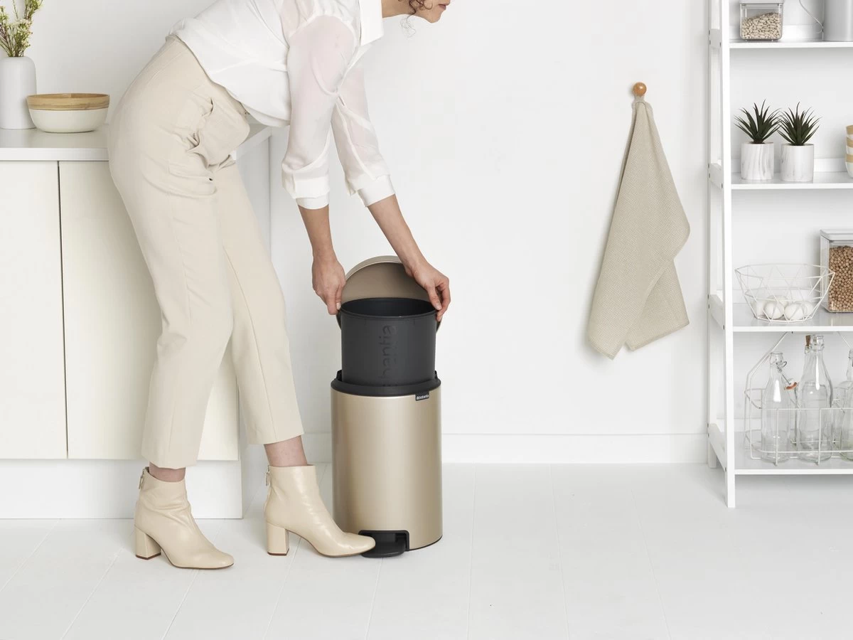 De Brabantia newIcon Prullenbak – 12 l – Metallic Gold met kunststof binnenemmer is een schoonheid voor in de keuken. Genoeg ruimte voor je afval en hij past perfect onder je aanrecht. Brabantia’s newIcon pedaalemmers zijn niet alleen iconische schoonheden, ze zijn ook betrouwbare hulpjes in de huishouding. Stevig en altijd stabiel, dankzij hun antislip onderkant en anti-kantel blok.