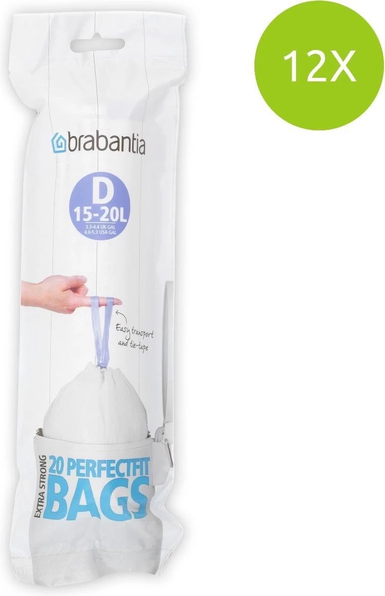 Voor elke bak een passende zak met deze set van 12 rollen van Brabantia Perfect Fit Vuilniszakken – 15/20 l – Code D. Brabantia afvalzakken zijn precies afgestemd op Brabantia pedaalemmers, prullenbakken, afvalemmers, Touch bins etc. Voor elk model is er een perfect passende afvalzak. Door de handige trekbandsluiting is de volle zak makkelijk te verwijderen en dicht te knopen.