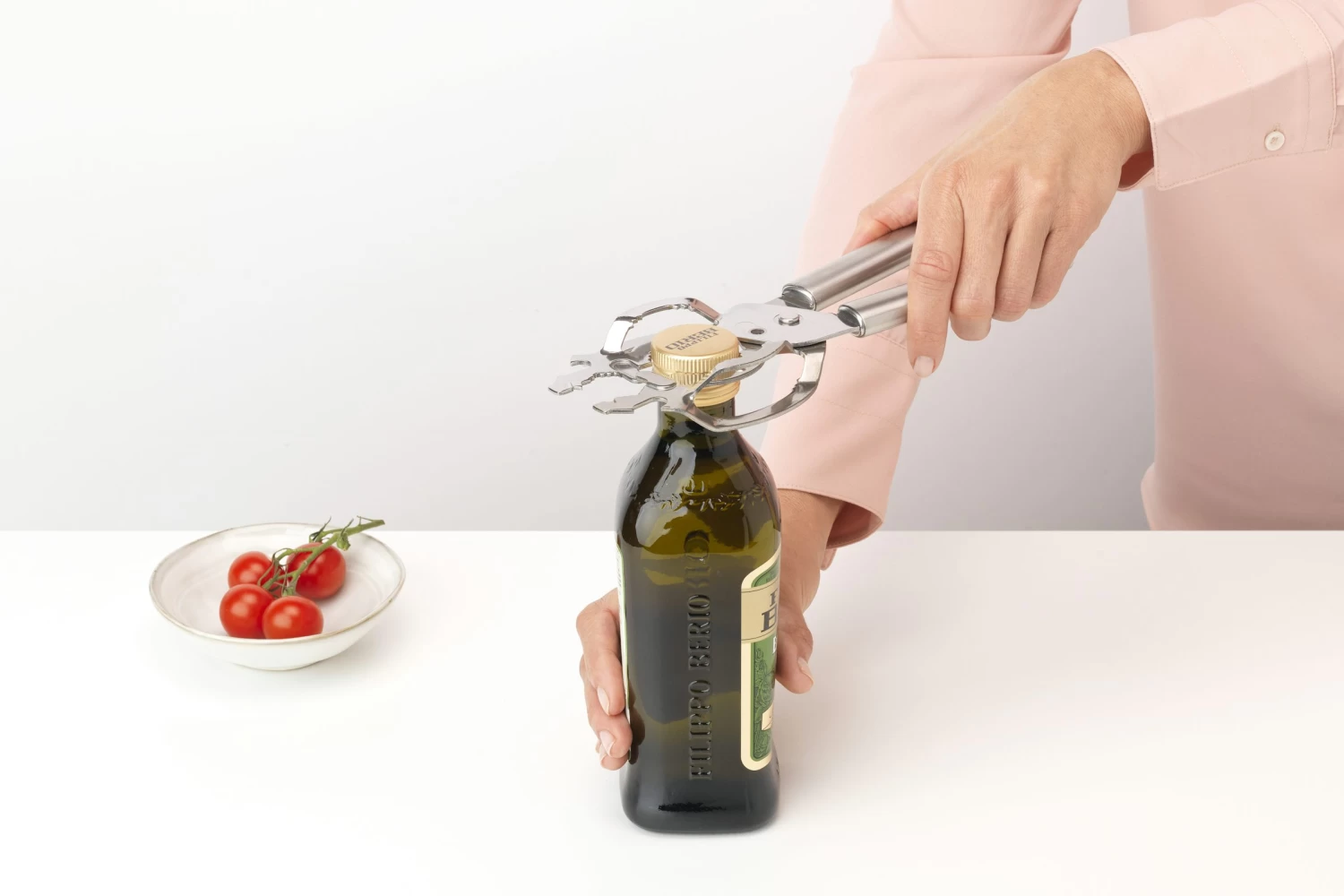 Viervoudige kracht – schroefdekselopener, flesopener, dekselwipper en perforator in één.
