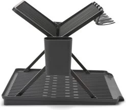 Op dit inklapbare Brabantia Sink Side Afdruiprek – Dark Grey met lekbak kun je al je borden, pannen en glazen kwijt – zelfs je breekbare wijnglazen. De bakjes voor bestek en keukengerei zijn afneembaar. Handig voor transport en bij het inklappen en opruimen van het rek. Een lekker rek dus, mooi genoeg om op je aanrecht te laten staan, maar ook makkelijk en klein op te bergen.