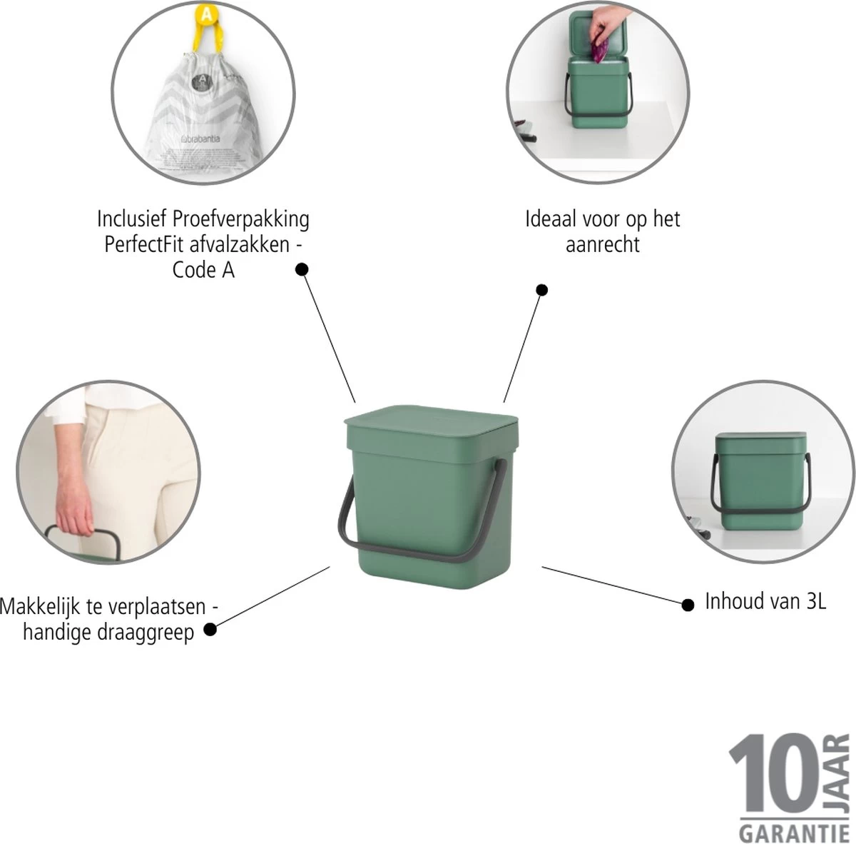 Brabantia Sort & Go Aanrecht Afvalbakje – 3 l – Fir Green