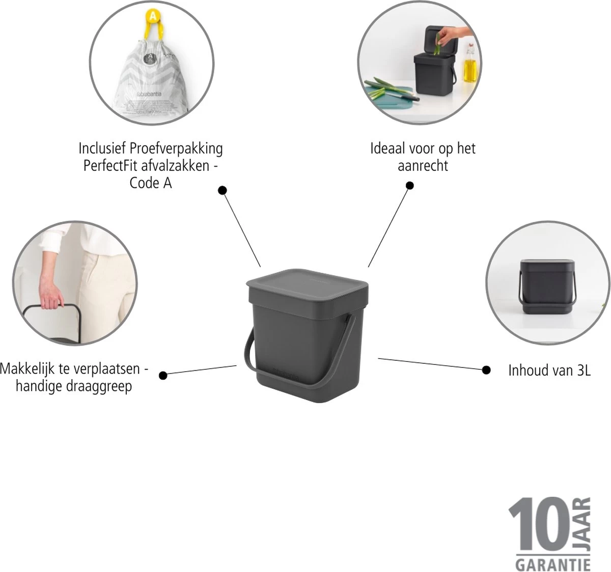 Brabantia Sort & Go Afvalbakje Aanrecht – 3 l – Dark Grey