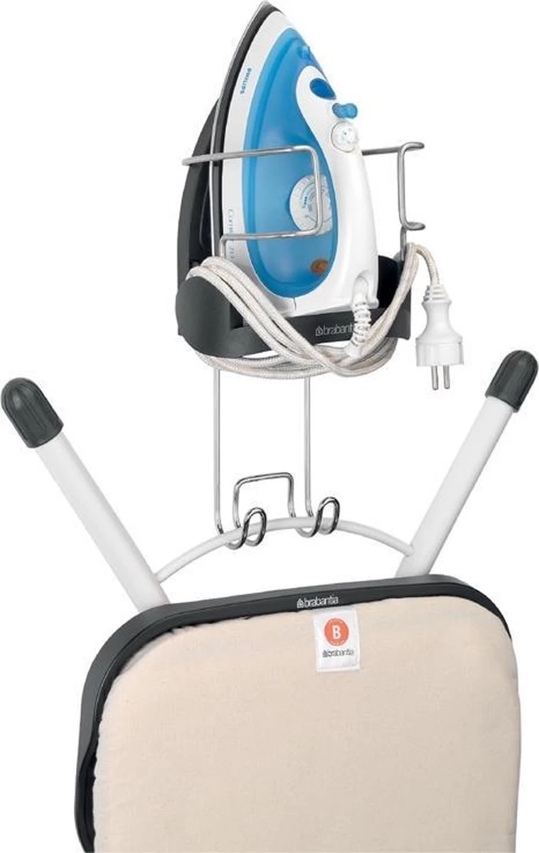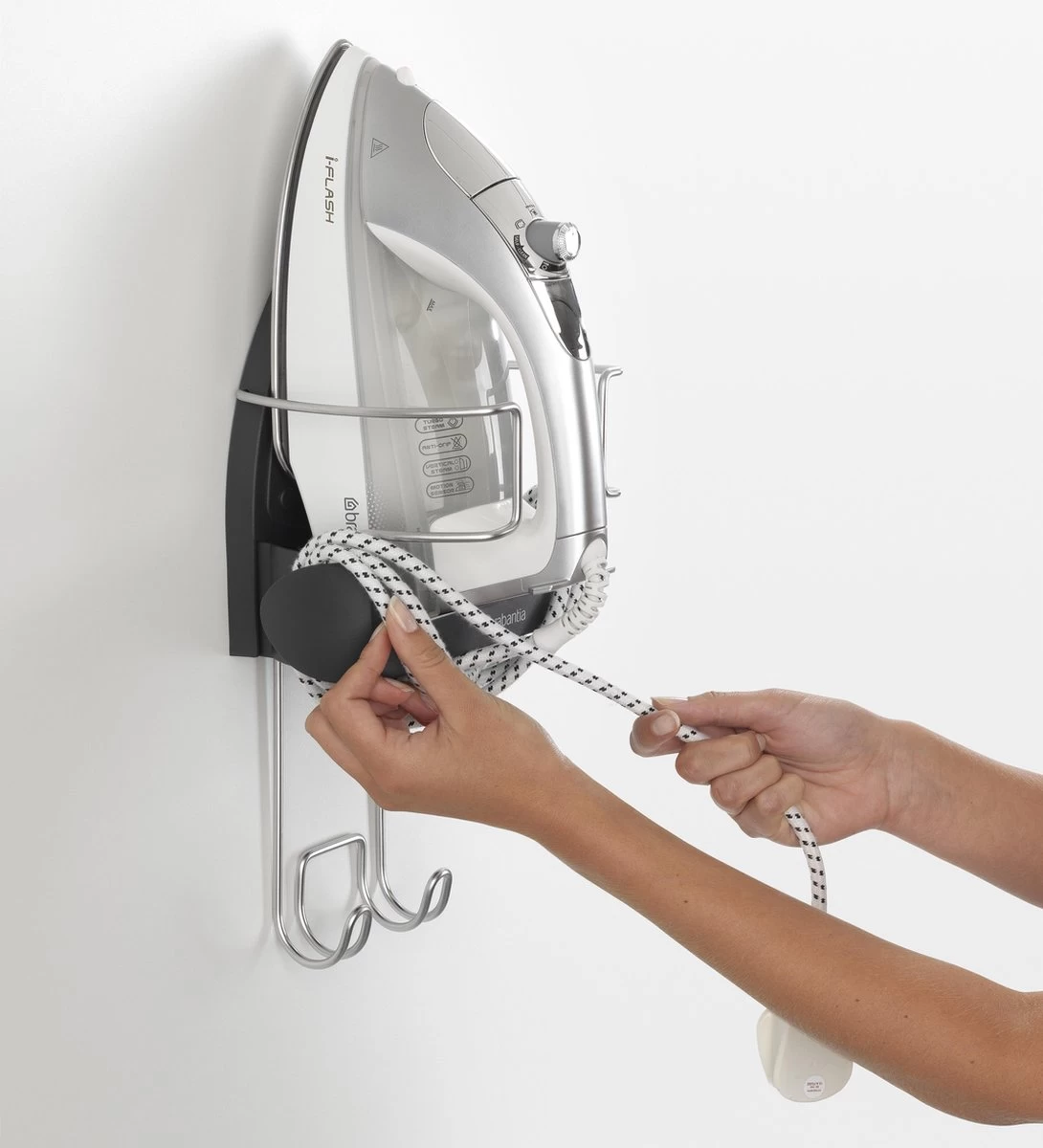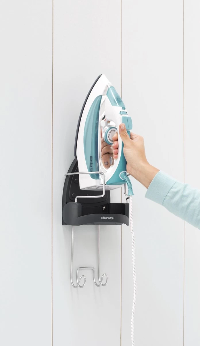 Klaar met strijken? Laat je strijkijzer niet afkoelen op je strijkplank, maar berg alles snel en veilig op met de strijksethouder van Brabantia. Gemaakt van hittebestendige materialen, dus eerst afkoelen hoeft niet. Zet je hete strijkijzer vast, rol het snoer op en hang de strijkplank aan de stevige haak. Veilig voor kleine handjes, netjes en opgeruimd in een mum van tijd.